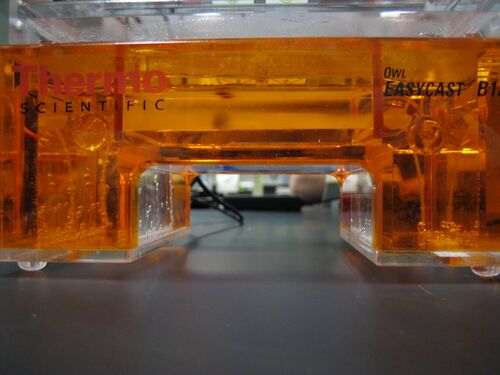 The second image is way blurry but it details the problem nicely, while the first image is clear, you can't quite make out what is wrong. The gel is crooked! I have no clue how that happened, but I see it as a problem since my DNA may get pulled out of the gel. I will probably lose up to half my DNA. Well I will have to do this process again anyways.