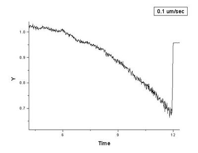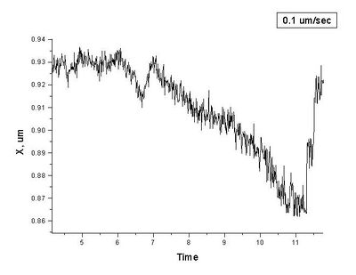There were some good tethers in the sample with my beads. So good that I found two tethers immediately (as in once I found the bottom surface there were 2 tethers). In all I tried unzipping 3 tethers and only one separated. This means that I either unzipped that tether or the bead came off. Not sure. The data for this is seen below (see Figures). There is deflection in both directions because we unzipped off center (meaning we didn't center x and y). In the x graph there is a jump at around 8 seconds and I don't know how to explain this.