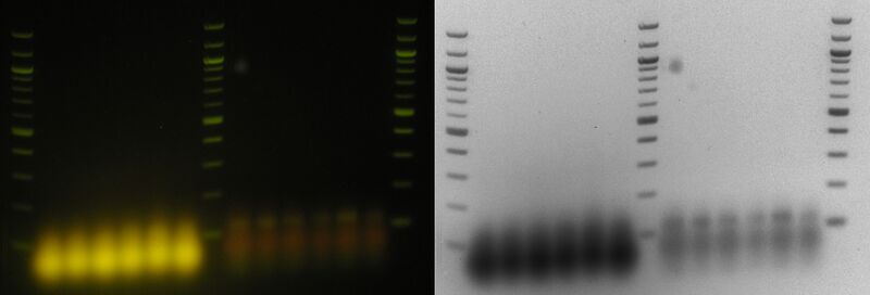 - Steve Koch 23:59, 4 February 2010 (EST): Also, I now realize this was an unforseen peril of SYBR safe. W/ Ethidium, would be using UV illumination and those labels probably not a big deal.