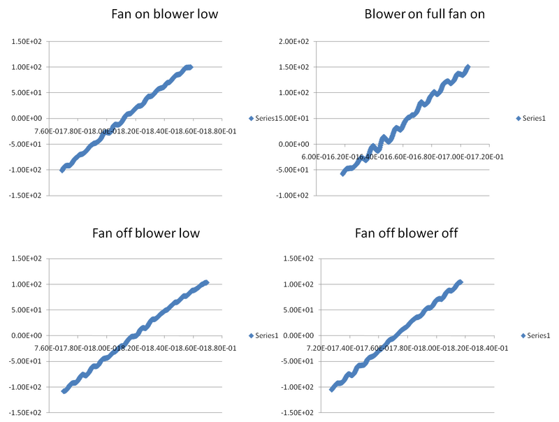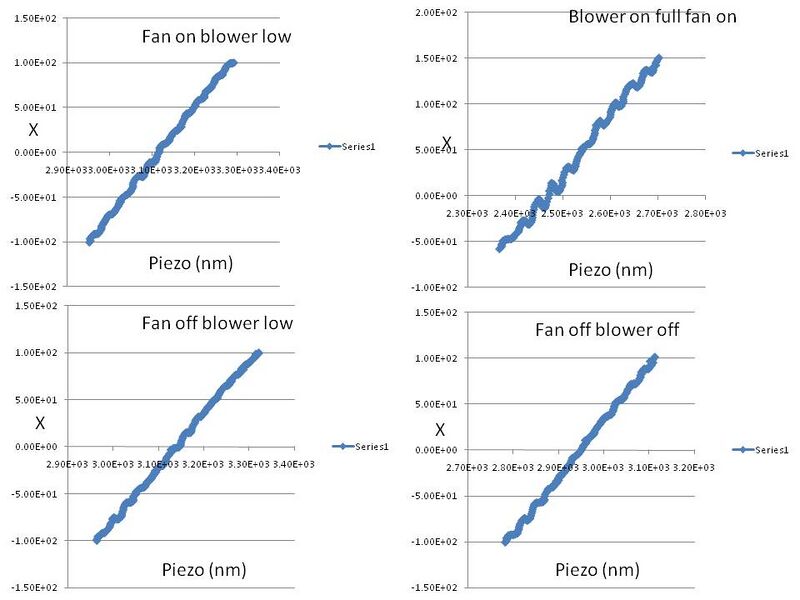 The old data is the top left corner labeled "Blower full fan on". Blower refers to the overhead vent and fan refers to the camera fan. We did some DOG profiles of the reduced vent with the fan on and off and then we turned the blower off completely and the fan and did another DOG profile (bottom right). We used the same settings from that first data set (on the feedback software) and used data over a distance of 200 in whatever units the x signal is. The data is distance vs time (even though it should be x vs piezo).