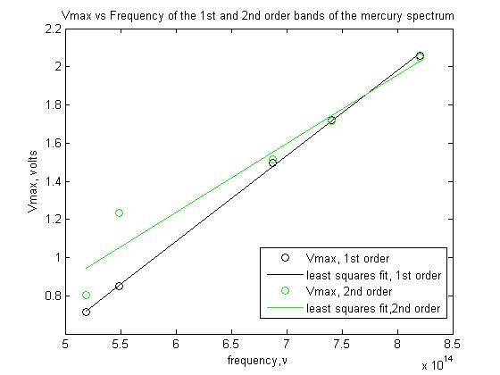 (Figure 4) My first set of data for Vmax measured at the different frequencies that make up the mercury spectrum. The maximum potential increases as the frequency of the light increases, supporting the quantum model of light. Notice how the 2nd order point corresponding to 5.5Hz is way out of line from all the other points of both 1st and 2nd order.