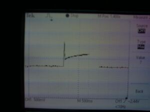 (Figure 3) Oscilloscope image of voltage vs time, the sharp spike in the wave form corresponds to the release of the discharge switch after which the voltage drops, then climbs towards its maximum in the expected fashion. (Steve Koch:Good start with the caption, but you should add more detail so the reader can understand the figure from the picture and caption alone. E.g., tell them, "The switch was released at the point where the trace begins to rise..." etc.)