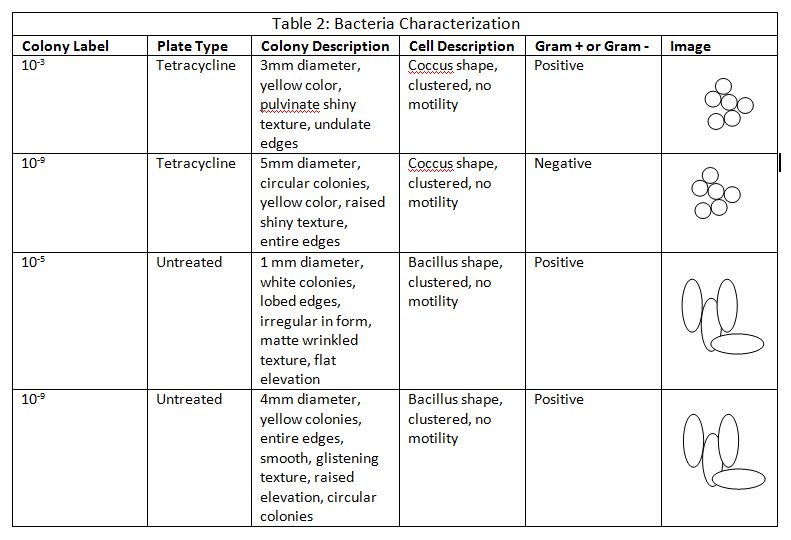 After five days, bacterial growth on the agar plates was observed and recorded using dissection and compound microscopes. To aid in viewing the bacteria, a Gram stain procedure was performed. A smear from four of the plates (two plain, two with tetracycline) was put onto a glass slide plate and mixed with a drop of water. The smear was heat fixed by passing the slide through a flame with the bacterial smear facing upward. Smears were then covered with crystal violet for one minute, then rinsed with water. The smears were then treated with Gram's iodine for one minute, then rinsed with water. The smears were then decolorized with a 95% alcohol solution for 10 seconds, then stained with safranin stain for 30 seconds. The slides were rinsed with water and blotted for excess water before being left to air dry for 15 minutes. Slides were observed using compound microscopes set for 40x and 100x.