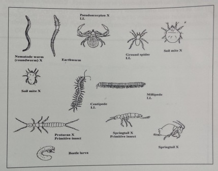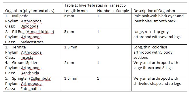 Among the invertebrates observed in the leaf litter, arthropodic forms were the most common. A total of five types were identified and characterized (Table 1). The five found were millipedes, pill bugs, termites, ground spiders and Springtails, with the millipede being the largest. Two termites were found, making them the most numerous found as every other type was only singular in count. These five organisms ranged in length from 1.5 mm to 6 mm. A chart detailing common soil invertebrates (Figure 1) was used to aid in the identification of these specimens.