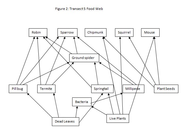 Biotic components benefiting these animals would be seeds and water as food sources for both rodents and birds, and insects as food sources for the birds. Both animal groups also doubtlessly benefit from any food litter left by passing humans. The trees are also a biotic benefit as both birds and and squirrels are arboreal creatures, making their nests in the branches from leaf litter and organic debris. Abiotic elements of the transect that benefit both animal groups are the moderate temperature, heavily shaded by trees, abundant rainfall which gives both groups a water source, and sunlight that grows the plants they all depend upon for environmental cover. A food web describing their roles alongside the other organisms present in the transect is below (Figure 2).