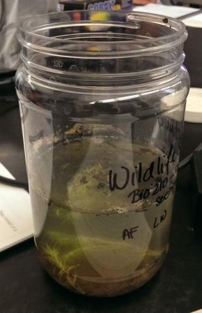 Data and Observations After two days, the hay culture was showing clear signs of decomposition. The jar had a pungent rotting smell and pieces of vegetation were blackened and floating on the surface. A light scummy film had begun to coat the water surface as well (Figure 1).