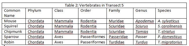 After observing vertebrate activity in the transect, not much variety was found. To that end, neighboring areas of the transect were observed to find vertebrates that might occasion the space. The types observed were birds (sparrows and robins) and rodents (squirrels, mice and chipmunks). Their classifications follow in Table 2.