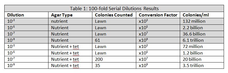 Materials and Methods The Hay infusion was agitated to mix up the organisms it contained. Then 100 μL were drawn from the middle of the jar, halfway to the bottom. These 100 μL were added to a plastic tube containing 10 ml of sterile broth. The tube was labeled 10-2 (a 1:100 dilution). 100 μL from that tube were then added to another plastic tube containing 100 ml of sterile broth for a 1:10,000 dilution(10-4). This process was repeated to form a 1:1,000,000 dilution and a 1:100,000,000 dilution, labeled 10-6 and 10-8, respectively. 100 μL of each of these dilutions were added to petri dishes containing nutrient agar. 100 μL of the 10-2 solution were spread on the surface of nutrient agar in petri dishes labeled 10-3, one gel containing tetracycline, the other left plain. This was repeated for each of the other tubes, with 10-4 going into dishes labeled 10-5 and so on. A glass spreader was used for procedure, and sterilized in a flame between applications. The agar dishes were covered and left to incubate in sunlight for five days.