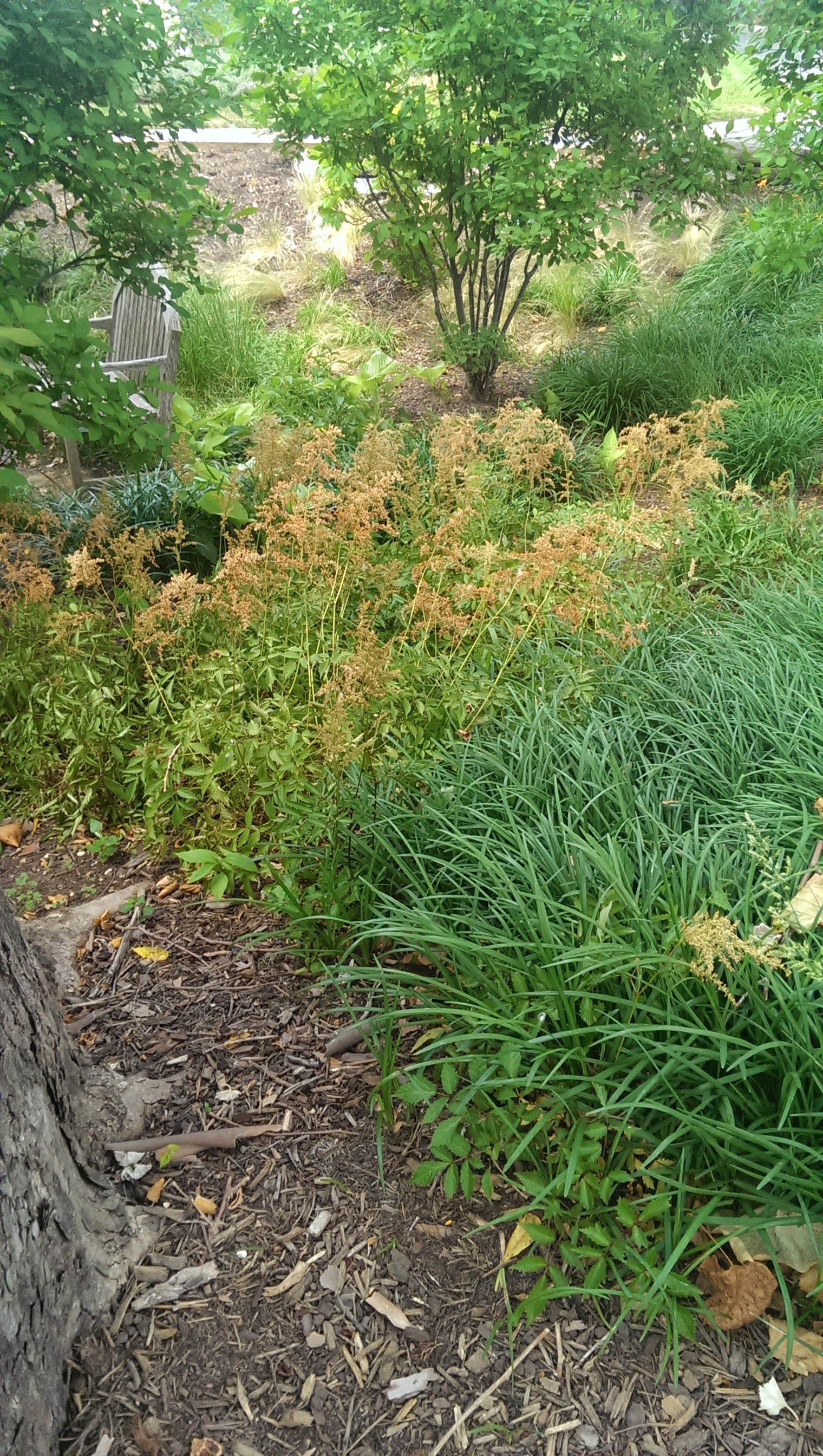 The site is bounded by two large oak trees, with two smaller, woody trees (possibly crepe myrtle) in the center. The majority of the ground cover is provided by day lilies (mondo grass) and ground moss. Hosta and an unidentified plant with feathery flowers (Figure 1) were observed as the low shrubs. Ground cover was about 80% of the vegetation observed.