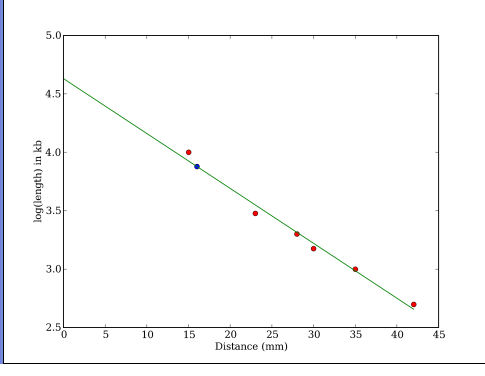 The equation for the line is log(length)= -0.0470008069791*distance+ 4.63072535356 When we plug in the distance traveled by our digested sample (15mm), the equation yields 8427.78113873 base pairs, which is really close to the expected 8669bp.