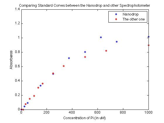 As before, the linear fit is not that great. There is an average error between the line and the measurements of 25%, but it is well enough to approximate the concentration of phosphate from the absorbance. Also, the data gathered today (at least for low concentrations) is very similar to the previous standard curve that was make in the other lab, It does seem at this point that the nanodrop is not incredibly accurate at high concentrations (greater than 500 uM). However, we won't be needing to measure concentration quite that high, so I think we are safe