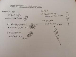 Hay Infusion- Smell and appearance: Smelled like sulfur (rotten eggs) with earthy (soil-like) undertones. The appearance was brown in color, murky water, floating filament on top, suspended grasses, overall had a uniformly brown color, settled filament on the bottom (looked like spoil, i.e. rocks, small sediment), on the top it looked like there was a white mold growing on top of the sediment. Niches: settled sediment (bottom)- soil, plant matter, pine needles, leaves Suspended (middle)- plant matter, suspended soil floating filament (top)- green plant matter, grass, sludge-like consistency, suspended soil(?)