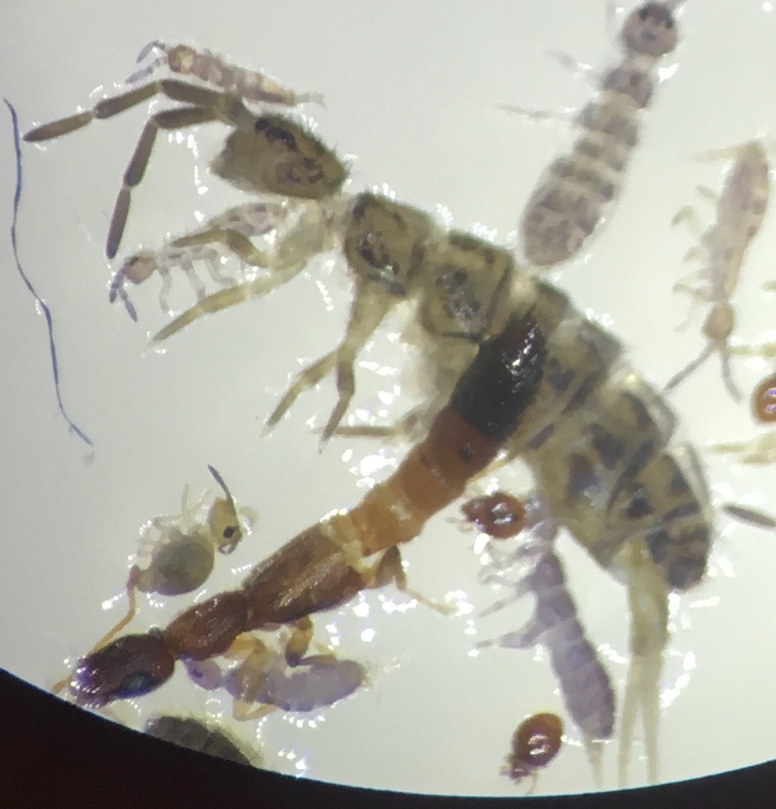 | Arthropoda/ Insecta | 25 | 1 | yellow, black eyes, antennas, 6 legs, no wings, segmented body, 2 antennas |