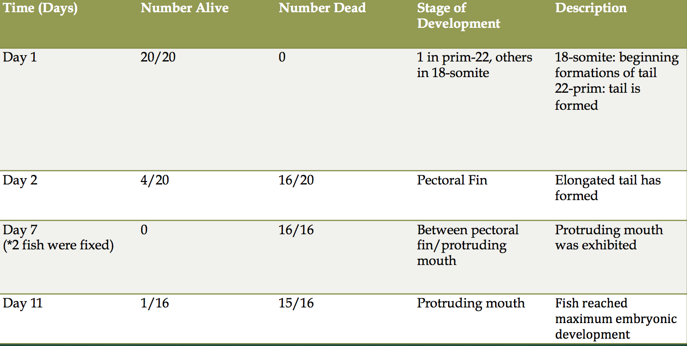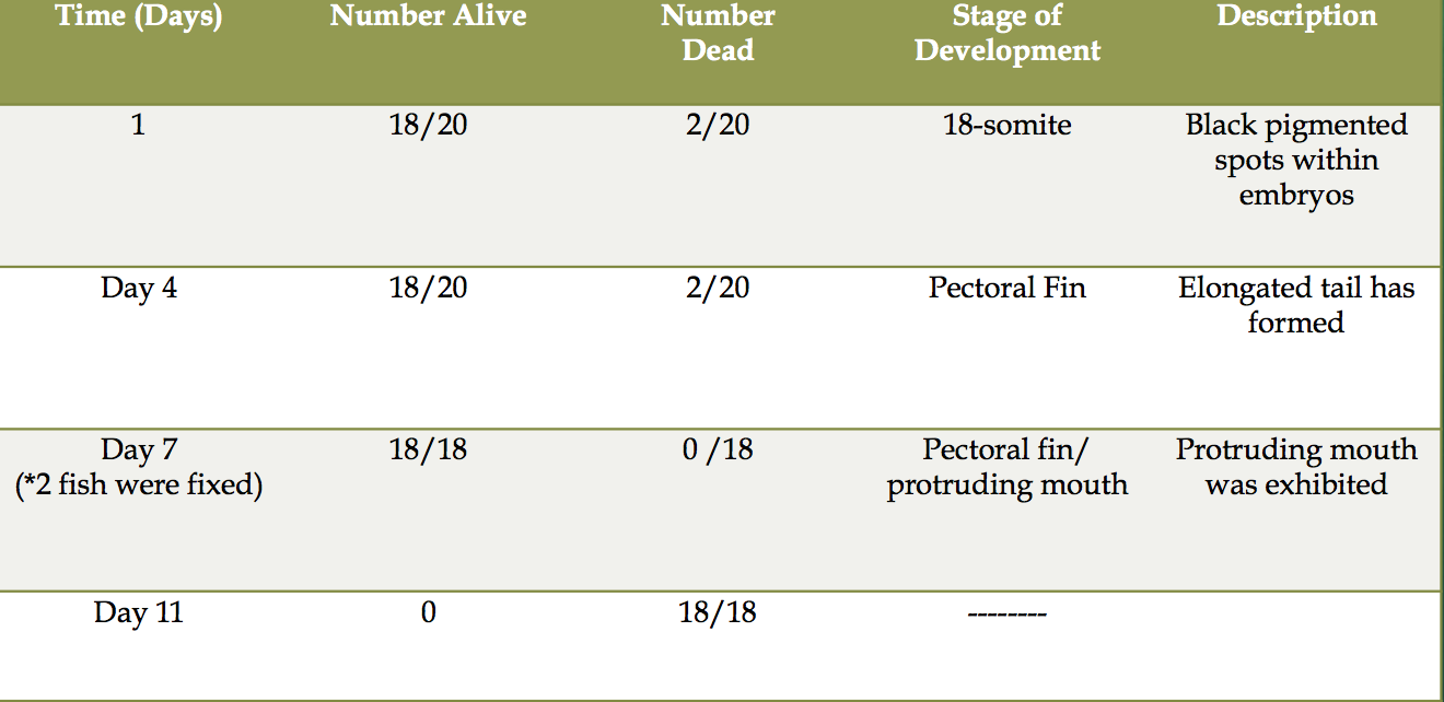 Objective: The purpose of this experiment was to determine the effect of fluoride on the embryonic development of zebra fish. We wanted to determine if fluoride acts as a teratogen, meaning it disrupts the development of the embryo. Our prediction was that Fluoride will disrupt the embryonic development of zebra fish.