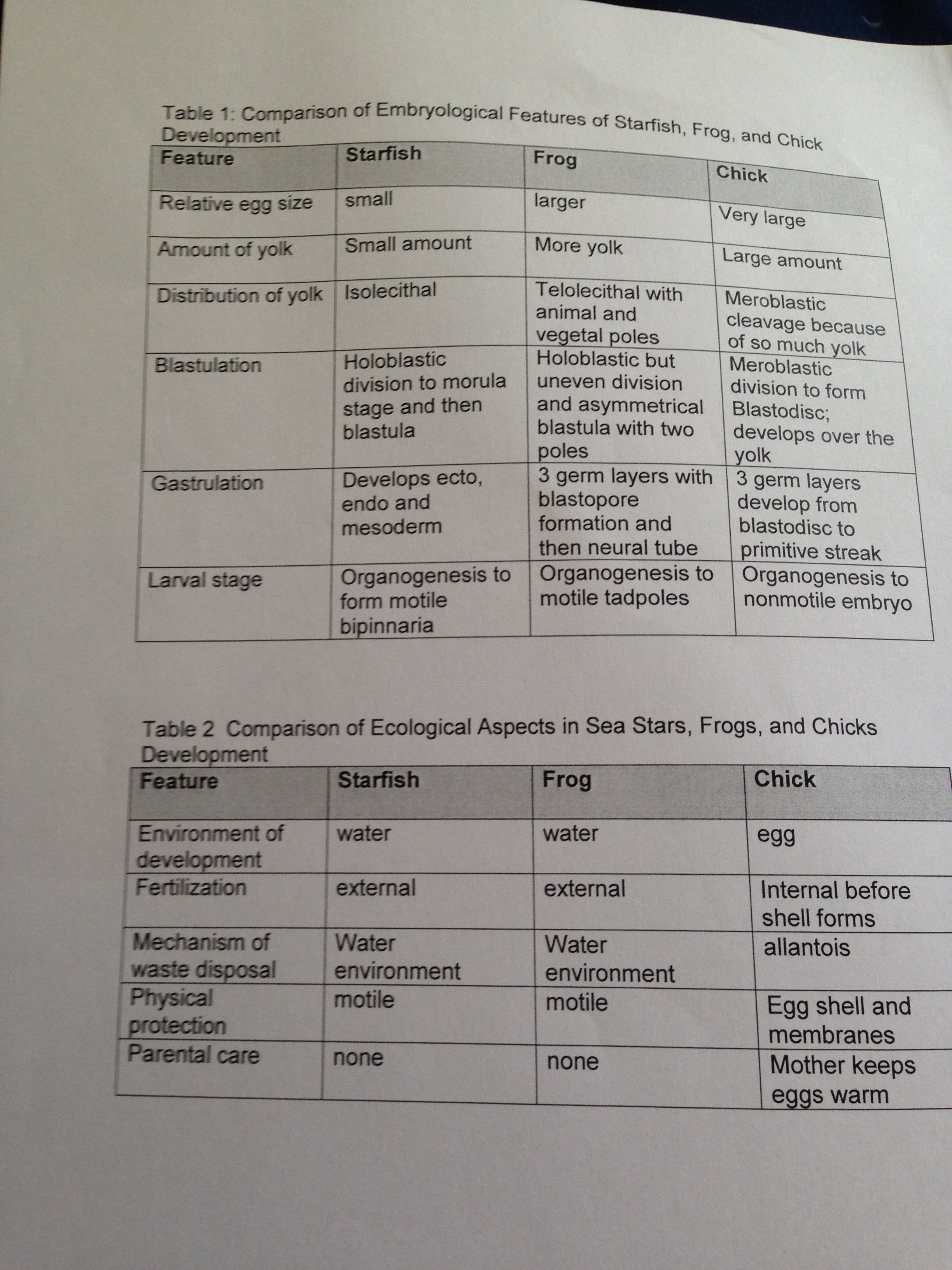 Figure 3. Table 1: Comparison of Embryological Features of Starfish, Frog, and Chick Table 2: Comparison of Ecological Aspects in Sea Stars, Frogs and Chick Development. -CB