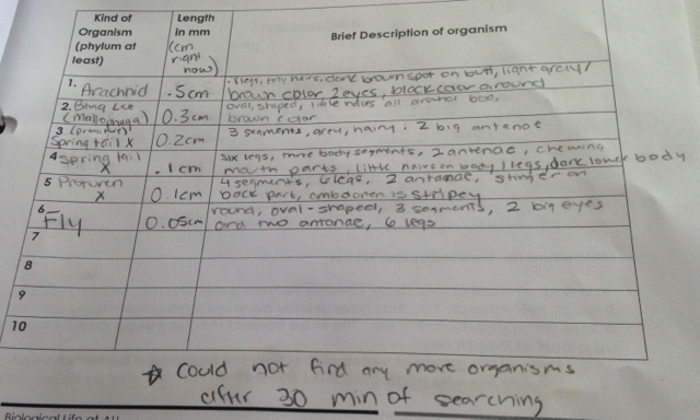 The size of the organisms ranged from 5 mm to 0.1 mm long. The largest organism was the Arachnid and the smallest organism was the Flea (Diptera). The most common organism was the springtails.