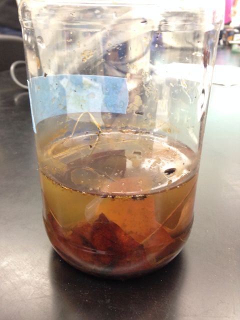 Description of Hay Infusion Culture: The culture has a yellow/orange tint. There are several small bubbles on the top of the liquid. There is also some plant debris in the culture. There are some small black dots on the top of the culture, which could be mold spots. The culture smells foul, and has a similar smell to mold.