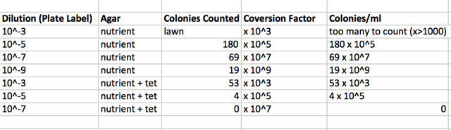 5. The tetracycline limited the number of bacteria present on the plates. The maximum number of colonies counted on the non-tet plates was 180 ( not counting the lawn that was observed as well). On the tet plates was 53 colonies. There were no fungi found on either plate.