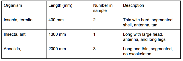 We identified three invertebrates in the sample from the top 15 mL, but there were none in the bottom sample. This suggests that the top environment was a better habitat for the invertebrates we found. The sizes of the organisms ranged from 400 mm to 2000 mm, with the Termite being the smallest and the Annelida being the largest. Insects were most prevalent in the top layer of ethanol from the leaf litter. See Table 1 below for details about the identified organisms.