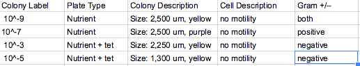 When observed under the microscope, the four bacterial smears were all found to have no motility. The size of the colonies on the nutrient agar plates were generally larger and had more gram positive results than the tet+ treated agar (Table 2). Below you can find pictures of the four colonies observed (Figures 1-4).