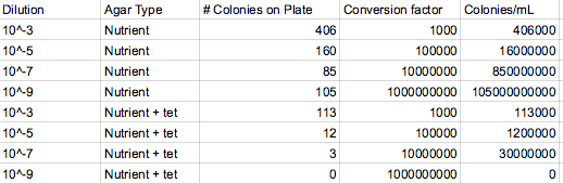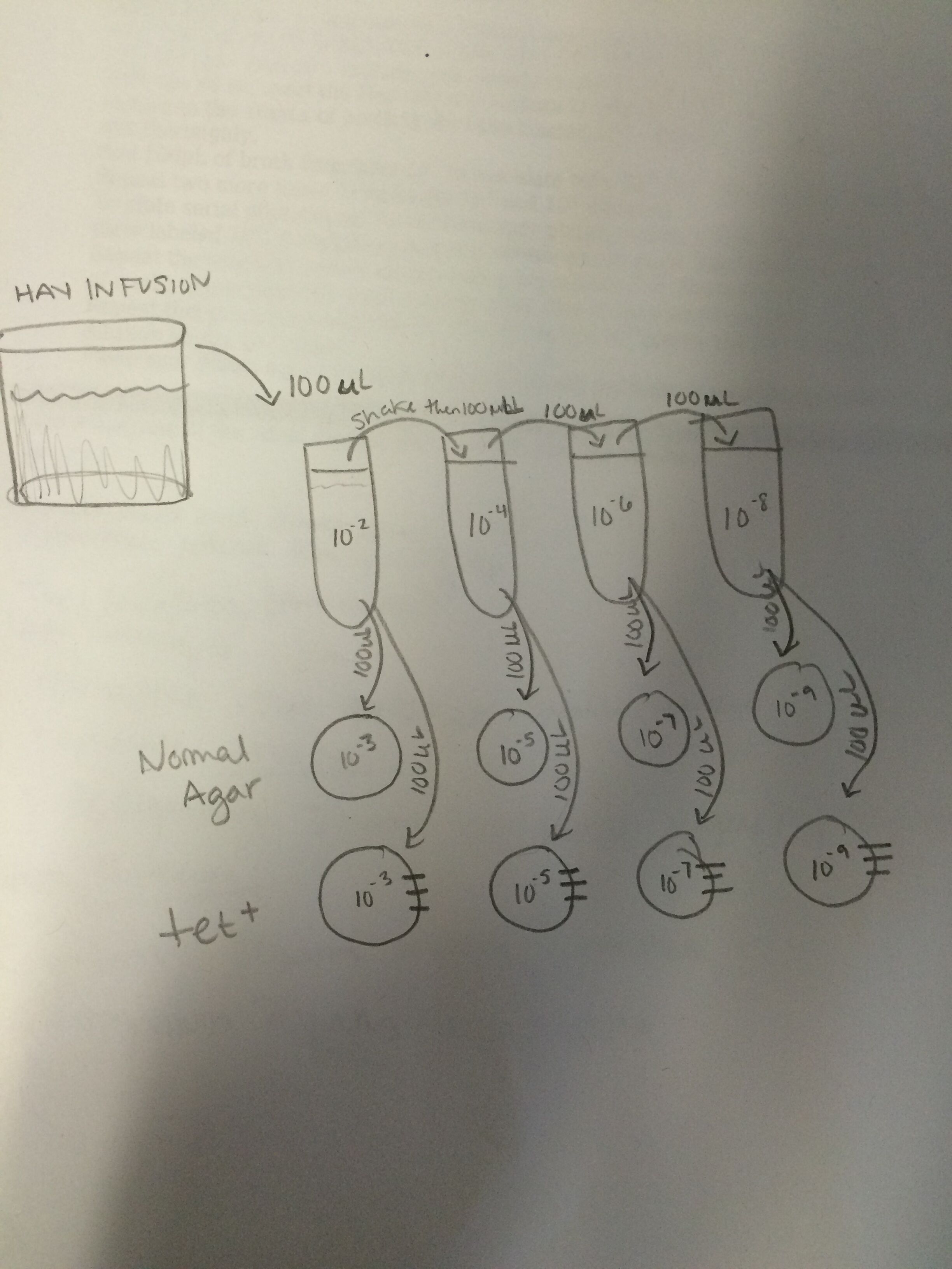 After that, a serial dilution was made to prepare for next week’s lab. Starting with four tubes with 10 mL of sterile broth, 100 uL of liquid from the Hay infusion were pipetted into the first tube, labeled 10^-2. 100 uL from the 10^-2 tube was put into the next tube, labeled 10^-4. This process was repeated to create tubes with 10^-6 and 10^-8 dilutions. From each dilution, 100 uL was plated onto an agar plate and a tet+ plate, making a 10^-3 dilution. The same was done with the 10^-4 dilution on 10^-5 plate, the 10^-6 dilution on the 10^-7 plates, and the 10^-8 dilution on the 10^-9 plates. The plates were then incubated at room temperature for one week. Below is a diagram explaining the serial dilution.