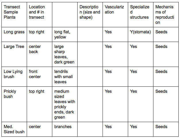 Plant samples documented and collected included long grass from the top right corner of the transect, a large tree from the center back, a low lying bush from the front center, a prickly bush from the top right corner, and a medium sized bush from the center (see map of transect in previous lab for spatial reference). All of the samples collected are plants. The vascularization of all of the plants was characterized by xylem and phloem. The height of plant 1 was 37 cm, plant two was 21 cm, plant 3 was 12.7 cm, plant 4 was 11.4 cm, and plant 5 was 11 cm. Due to the season, no seeds were found in the plant samples so we were unable to categorize them as monocot or dicot. See Table 1 and Photos 1-5 below.