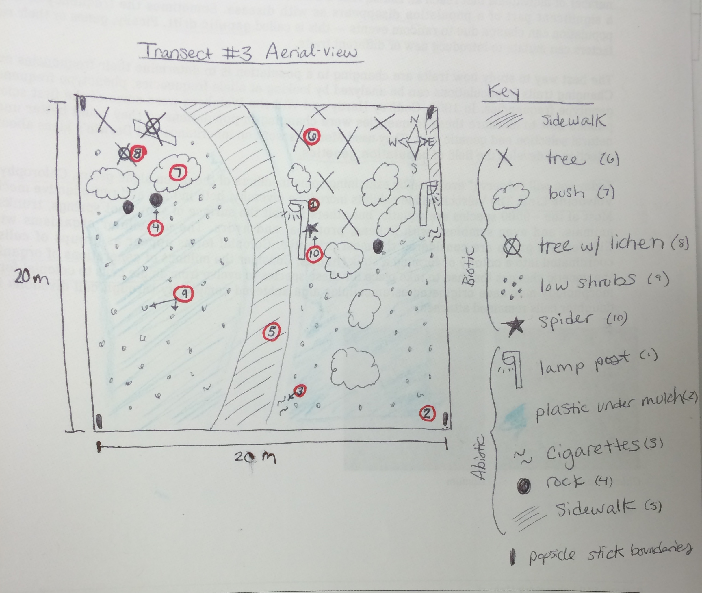 To create an aerial map of the 20 by 20 meter transect, a map was first hand-drawn and later refined by using Google Earth images. Popsicle sticks marked the edges of Transect 3. While drawing the map, topography, abiotic, and biotic features were considered.