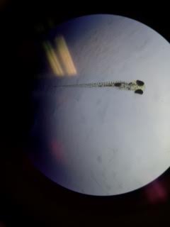 We observed two different specimen in this sample. Using the dichotomous key, we identified the long, stringy, amber colored organisms as being Spirostomum. Spirostomum is a ciliophora and a eukaryote. This was due in part to the organism's texture, color, shape, and size- 1-3 um in length. The second type of organism, the colorless, bubble-like circles, we identified as being Chlamydomonas.