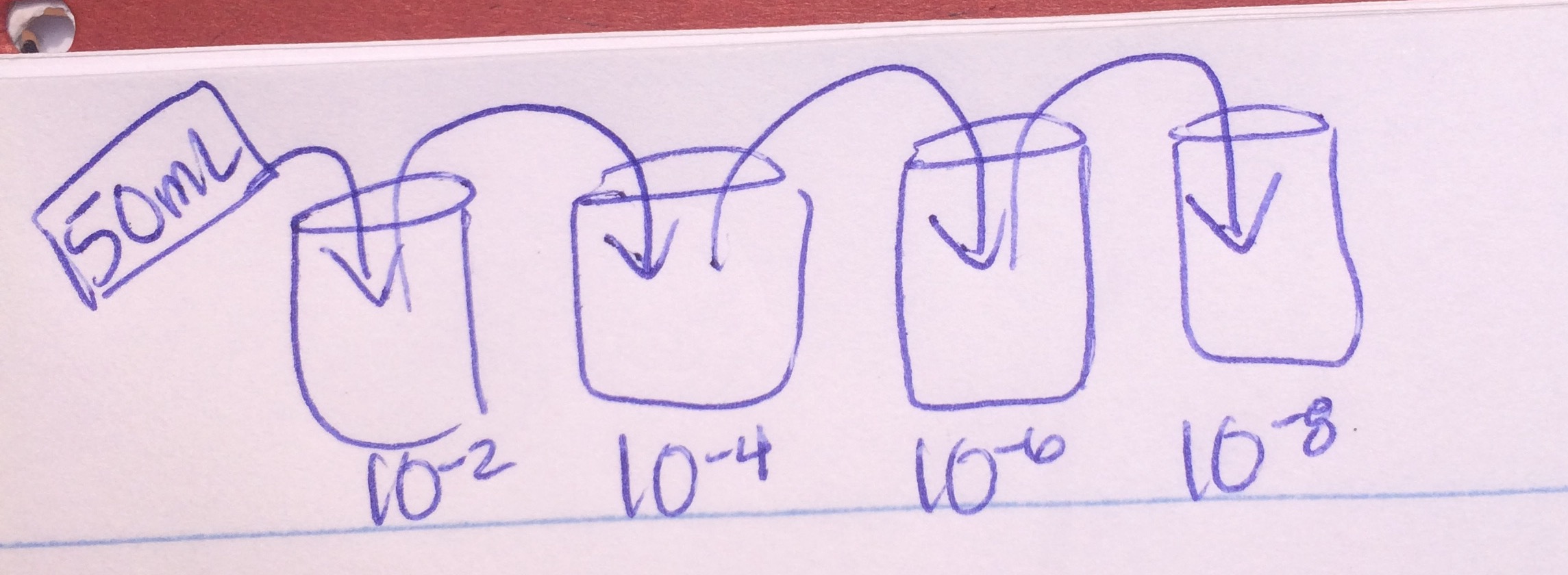 The Hay Infusion culture that was created last class was carefully brought over to the work area. The culture was then observed before two samples were taken from the culture. A sample was taken from the top and a wet mount was created by placing two drops on the slide and covering it with a cover slip. Using the same method, a sample from the bottom was also used to make a wet mount. These samples were then studied under a microscope and when an organism was spotted, a dichotomous key was used to identify it by answering the series of questions surrounding the organism's motion, shape, size, color, etc. Then nutrient agar petri dishes were inoculated with different concentrations of the culture. Four tubes of 5mLs sterile broth was labeled staring with 10^-2 and decreasing by a power of 2 for each tube. Four nutrient agar plates were also labeled starting with 10^-3 and decreasing by a power of 2. Finally four nutrient agar plus tetracycline plates were labeled with "tet" and also with 10^-3 and decreasing by a power of 2 for each plate. The Hay Infusion Culture was then mixed up and 50uL of the culture was added to the first tube, labeled 10^-2. 100uL from this tube was pipetted to the next tube and so forth until all the tubes were appropriately diluted. The serial dilution was then plated by pipetting 100uL from the first tube onto the nutrient agar plate labeled 10^-3 and carefully spreading it on the plate. This was then done for each agar plate and the corresponding tube and then again for the +tet plates. The agar plates were then placed agar side up in a rack to incubate at room temperature for five days (Bentley, 2015).