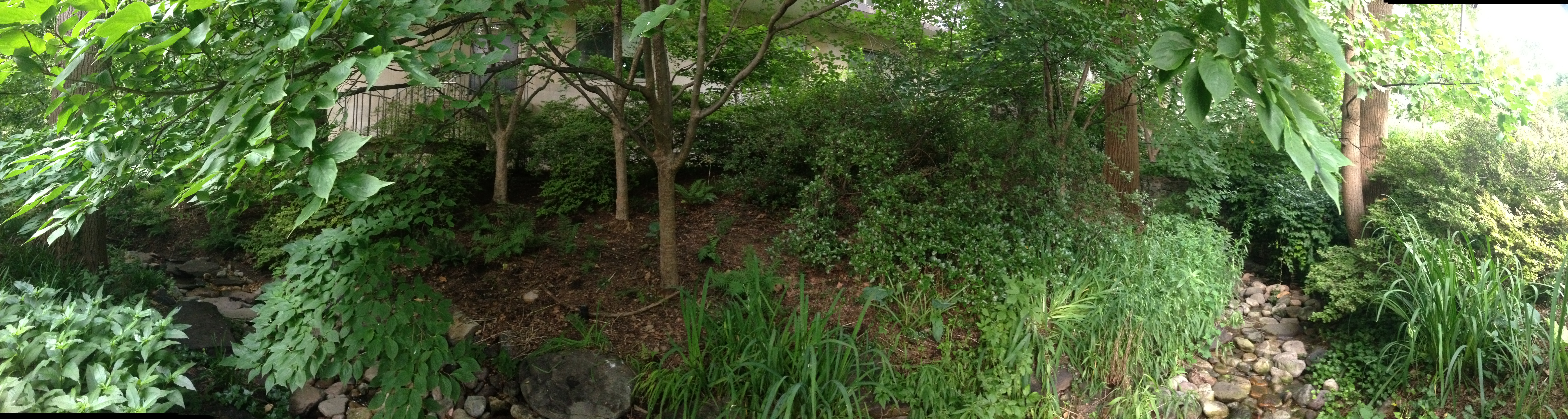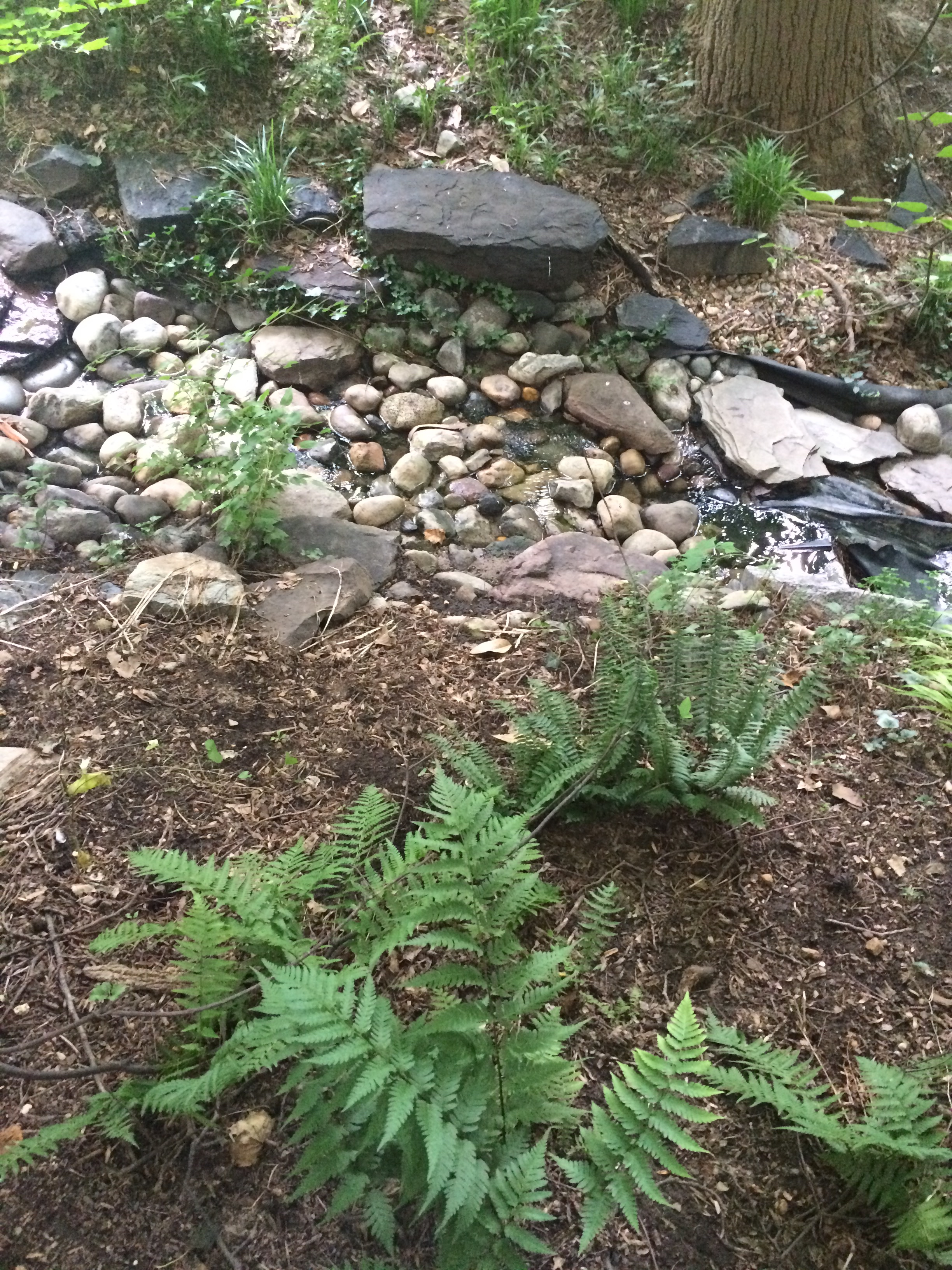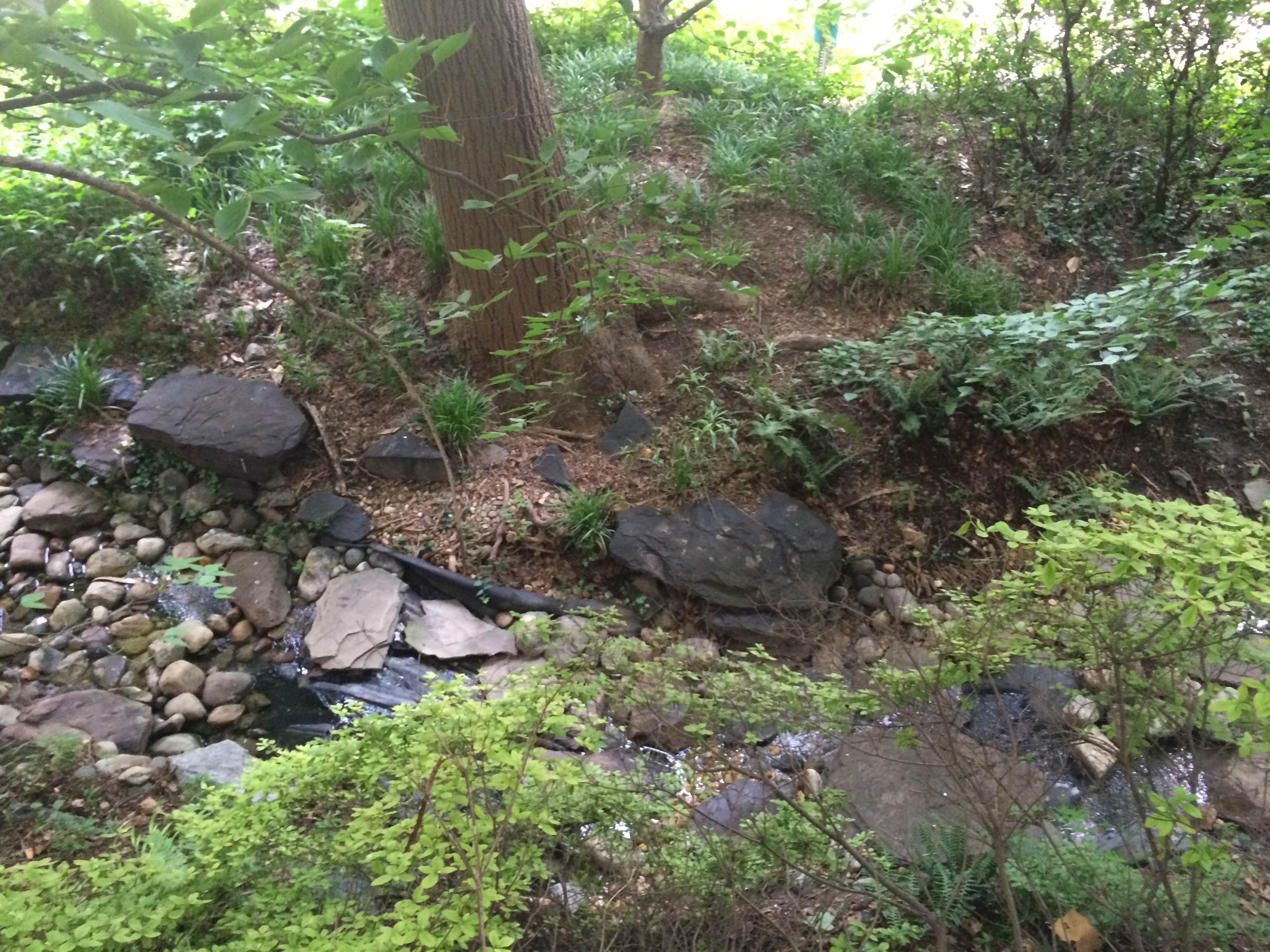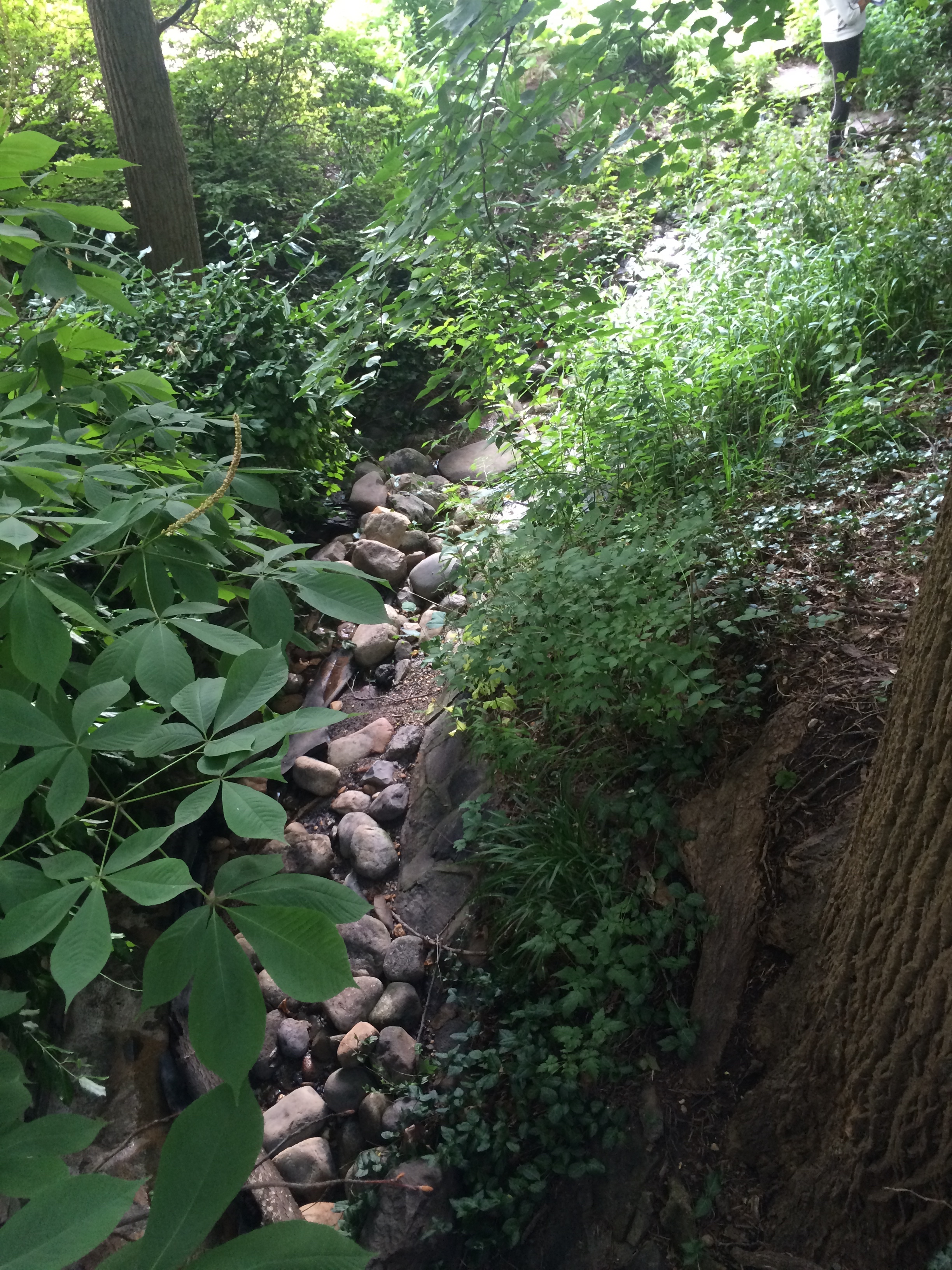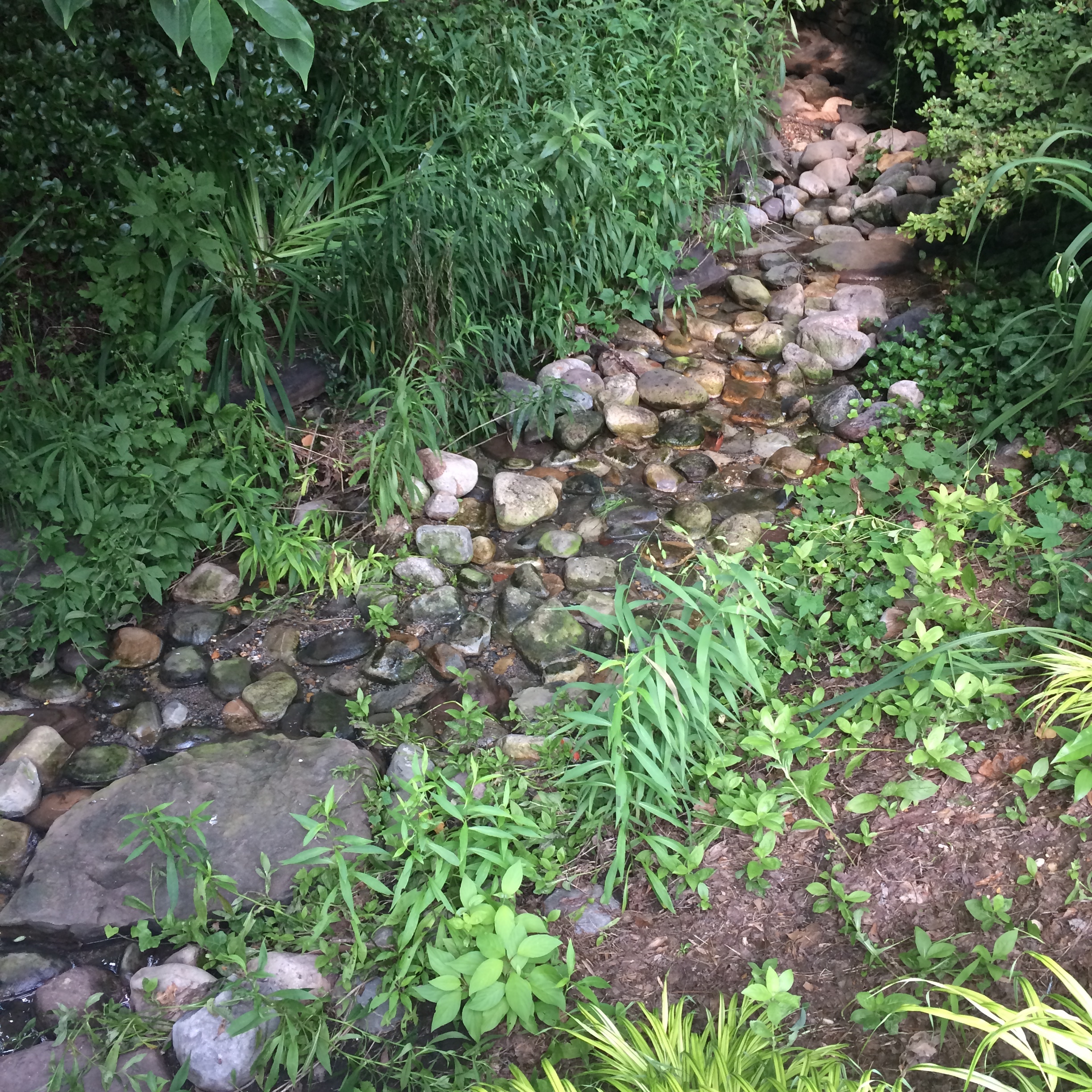 The selected transect consisted of trees, both big and small, with a stream running down the center of the transect. The stream was full of rocks along with sand. There was soil covering all the ground of the transect that was not the stream and there were bushes, ferns, weeds, and other plants. The transect was hilly, with the stream at the bottom and the land rising up on both sides of the stream. The biotic factors were the plants, trees, ferns, weeds, ants, and a few small birds. The plants and trees were spread around the stream, the birds were seen bathing in the stream, and the ants were seen crawling throughout the transect. The abiotic factors were the rocks, found in the stream, the water, dirt, air, and sand. The below images show the transect.