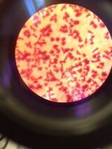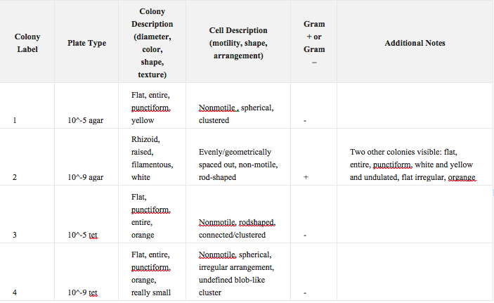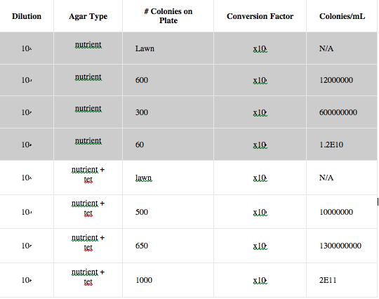 First, the agar and tetracyline plates were observed to determine the amount of bacteria growth. The number of colonies on the plate were recorded. The growth from the two different types of plates were then compared. Then the bacteria was Gram stained. This was done by choosing four colonies, two from two different agar plates, and two from two different tet plates, and mixing the colonies in a drop of water on four different slides. The area underneath the drops was then circled and passed over a flame multiple times until they were heat fixed. The bacterial smears were then covered with crystal violet for 1 minute before being rinsed off using a water wash bottle. Then the slides were covered with iodine mordant for 1 minute and again rinsed off. Next the decolarization solvent was used to flood the bacterial smears for 10-20 seconds. Finally the smears were covered with safranin for 20-30 seconds before this was rinsed off with water wash bottle. The slides were then allowed to dry before being examined under a microscope. Information about size and gram-positive/negative was recorded (Bentley, 2015).