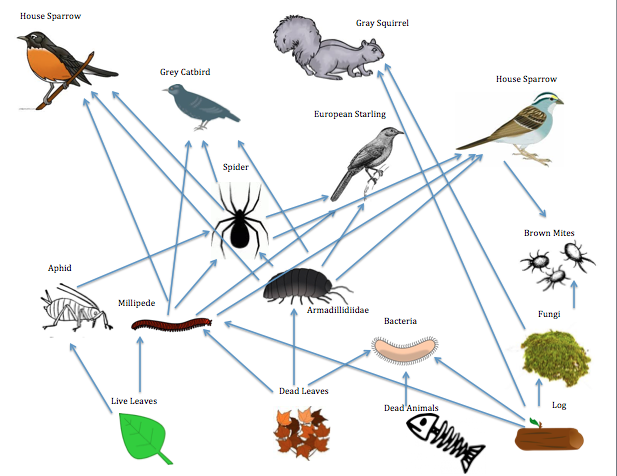 The invertebrates that were discovered displayed the diversity of invertebrates in that while they were all the same phylum, only two were the same class. They also ranged in size form 1- 10 mm with the largest organism being the Anthropoda Diplopoda, also known as the millipede, and the smallest one being the Anthropoda Insecta, known as the aphid, which was only 1 mm. The millipede gets its size from its length where as the aphid is a small round bug. The Anthropoda Arachnida, or the big brown mite, was the most common invertebrate found in the results of the Berlese funnel. The vertebrates however were not as varied, with four of the five organisms being from the same class, Aves. This could be indicative of the types of vertebrates found in the transect or it could be that larger animals are more easily spooked by observers and habitat a larger area so that they are harder to observe in the transect. This could also just be because of the biotic and abiotic factors of the transect. The biotic factors of the transect such as the insects and worms would greatly benefit the birds since they are the bird's food source. The trees would also benefit the birds since they provide shelter and a place to create a nest. The trees and plants would also aid the squirrels since they eat tree bark, berries, nuts, and seeds, which all are produced by trees and plants. The abiotic factors that benefit both the birds and the squirrels are the stream, the shade, and the dirt. The birds use the stream to bathe and to drink and the squirrels use the stream to bathe. All the animals benefit from the shade during the hot humid summer months and the dirt provides a benefit to the squirrels so that they can bury their nuts in order to eat them during the winter months. The animals, bacteria, fungi, insects, and plants all intersect in the transect to form a community. This community consists of many different trophic levels. A trophic level is group of organisms that all obtain energy from the same source (Freeman, 2014). These trophic levels are evident in the food web below where it can be seen that millipedes and bacteria are on the same trophic level since they both get their food from logs and dead leaves. Organisms that are on the same trophic levels are often limited by the same carrying capacity since they have to compete against each other for food. The carrying capacity for an organism is the maximum population size the environment can support due to habitat space, food availability, water availability, etc (Freeman, 2014). Not just on a trophic level, but throughout the community these animals often compete for habitat and resources and carrying capacity determines how many of them can survive. However, as seen in the below food web, when an animal does die, it provides the nutrients to other organisms and allows the food web to continue. In this way the circle of life goes on and the community found in the transect continues to survive.