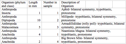 Last week a Berlese funnel was set up under a hot lamp by placing ethanol in a tube below a funnel filled with leaf debri. In this lab, the Berlese funnel was deconstructed and the captured invertebrates were studied underneath a microscope. Using a dichotomous key, the organisms were identified and these results were recorded. The number of invertebrates in the sample and the size of the invertebrates was also recorded. Finally the transect was visited and five vertebrate species that were found there were recorded (Bentley, 2015).