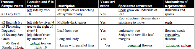 The five plants found in the transect were lady fern, english ivy, flowering dogwood, swamp saw grass, and royal standard hosta. They are pictured below.