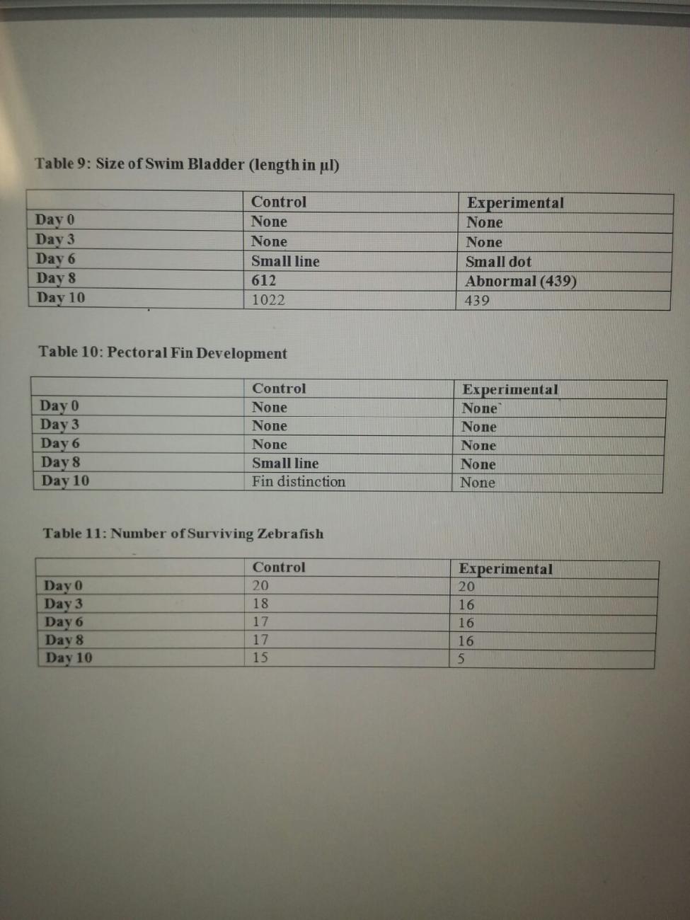 Table 9: Swim bladder on alcohol exposed fish is much smaller and developed later than those in the control group. Table 10: Pectoral fin never developed in experimental group. Table 11: Throughout the experiment, only 5 of the control group fish died, while the majority of the experimental group did.