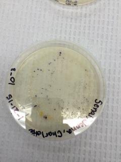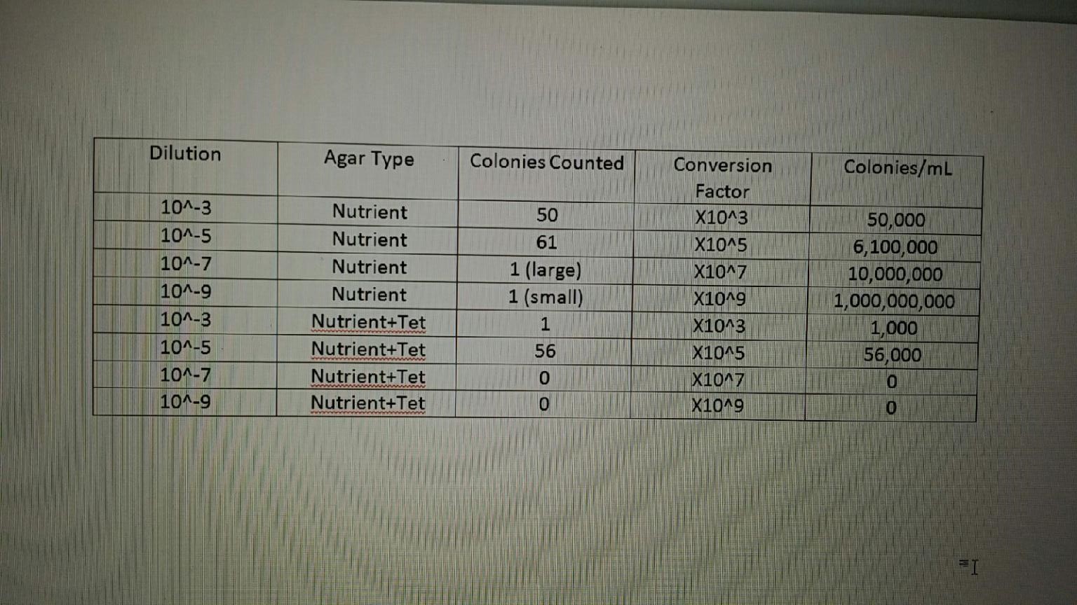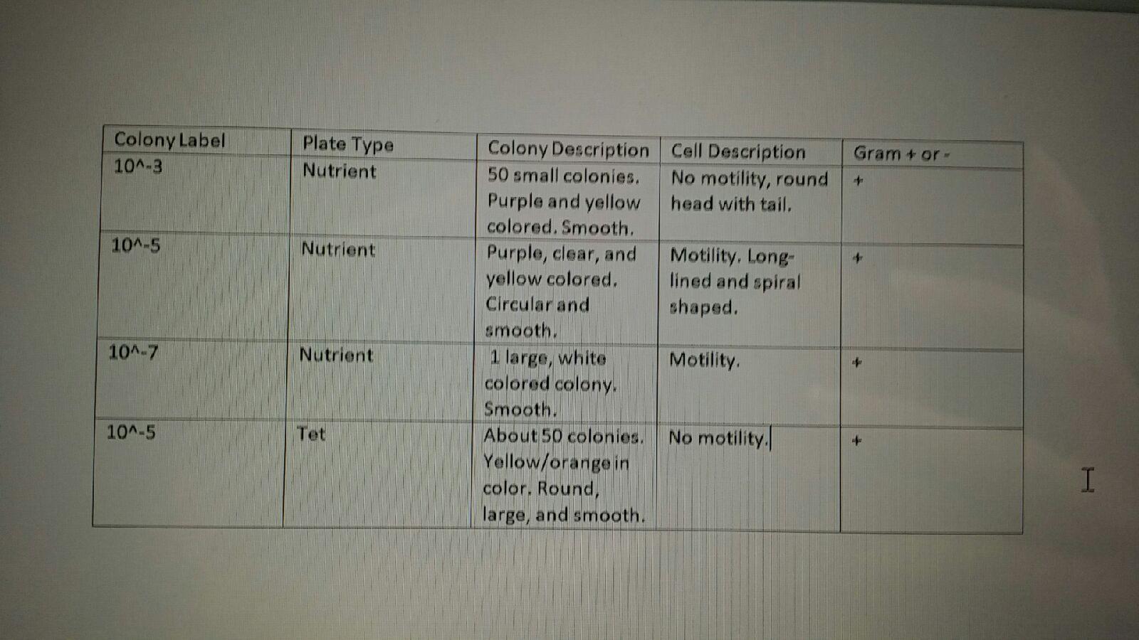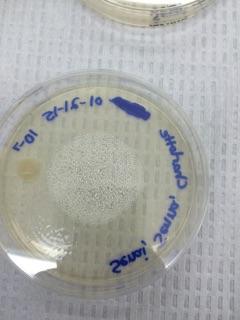 Materials/Methods: We first retrieved our eight plates and counted the number of bacteria colonies growing on the plates. We chose 3 plates that contained the nutrient agar and 1 plate that contained the tetracycline to observe. We then made wet mounts and gram stains of the four samples. To make a gram stain, we sterilized a loop over a flame and scraped up some growth from the agar. We then added a drop of water to the slide. We then heat fixed the slide by passing it over a flame a few times. Then we followed the directions on the gram stain instruction paper covering the slides with Gram's iodine, crystal violet, alcohol, and safranin. We then looked at them under a microscope. Then, we set up the PCR procedure for next week's lab. We transferred a single colony of the bacteria of from the nutrient agar plate and one colony from the Tetracycline plate. We put them each in their own tube with 100μL of water. Then we incubated them at 100°C for 10 minutes in a heat block making sure the tubes were floating. Then we centrifuged the samples for 5 minutes at 13,400 rpm. During this time, we added 20μL of a primer/water mixture to a labeled PCR tube. Then mixed to dissolve the PCR bead. Then we transferred 5μL of supernatant from the centrifuges samples to the PCR reaction and placed the tube in the PCR machine.