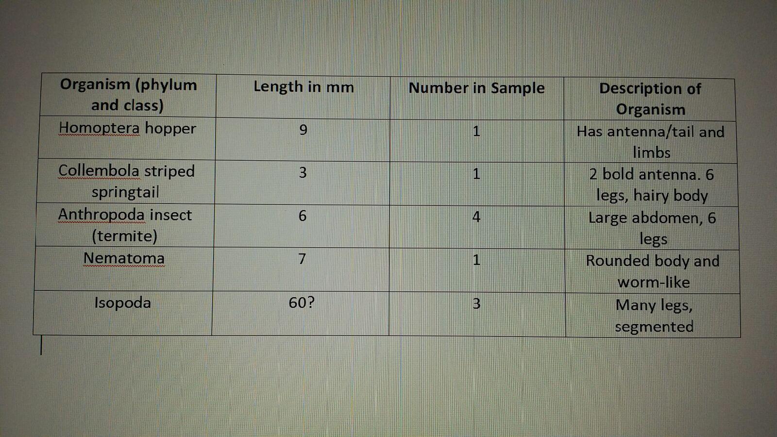 Results: We were unable to observe movement in the cross sections because they were prepared slides and obviously dead. However, we did see what it looks like as it goes through the digestive tract by looking at the different slides, it just was not in real time. The five invertebrates that we observed were Homoptera hopper, Collembola striped springtail, anthropoda insecta, nematoma, and isopoda. The size ranges were all very similar ranging from 3 to 9mm, with one being quite a bit larger at 60 mm. The Isopoda was the largest organism measured from our transect. The Collembola striped springtail was the smallest organism measured from our transect. The most common organism found in our leaf litter was anthropoda insecta, which makes sense because they are termites.