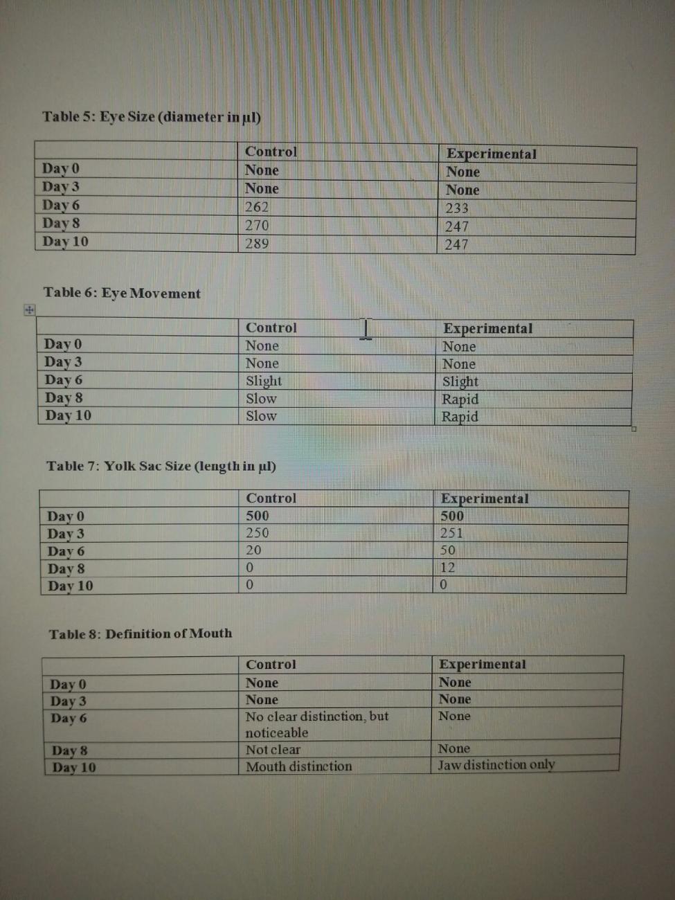Table 5: The eye size of the control group was larger than those of the experimental group. Table 6: The Zebrafish in the experimental group had much faster eye movements than those in the control. Table 7: The yolk sac took the experimental group much longer to disappear than the control. Table 8: The experimental group never developed any mouth definition, while the control group had one at the end of two weeks.