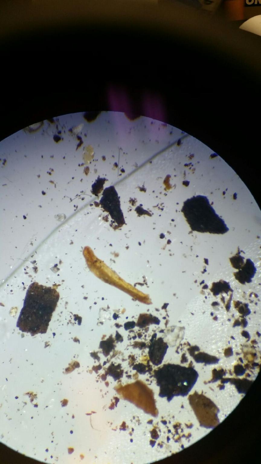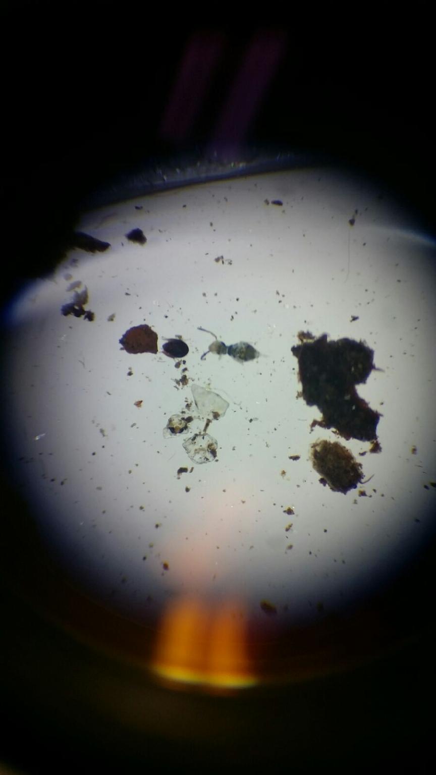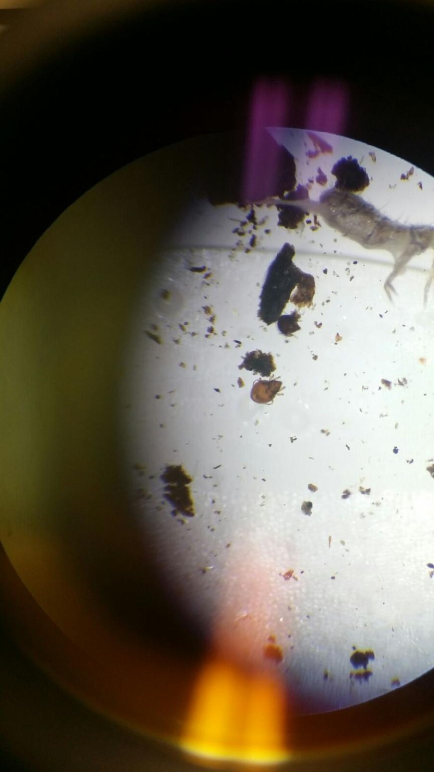 Materials/Methods: We broke down the funnel and poured the top 15mLs of liquid and organisms into a petri dish. About 15mLs of the remaining liquid was poured into a second petri dish and labeled. The rest of the remaining liquid was kept on the side just in case we needed more observations later in the lab. We then looked at both petri dishes under dissecting microscopes to identify organisms from our transect. We also observed a cross section of Planaria yolk that were recently fed to see the digestive tract. We used an online key to determine what the organisms were: http://www.hope.edu/academic/biology/leaflitterarthropods/