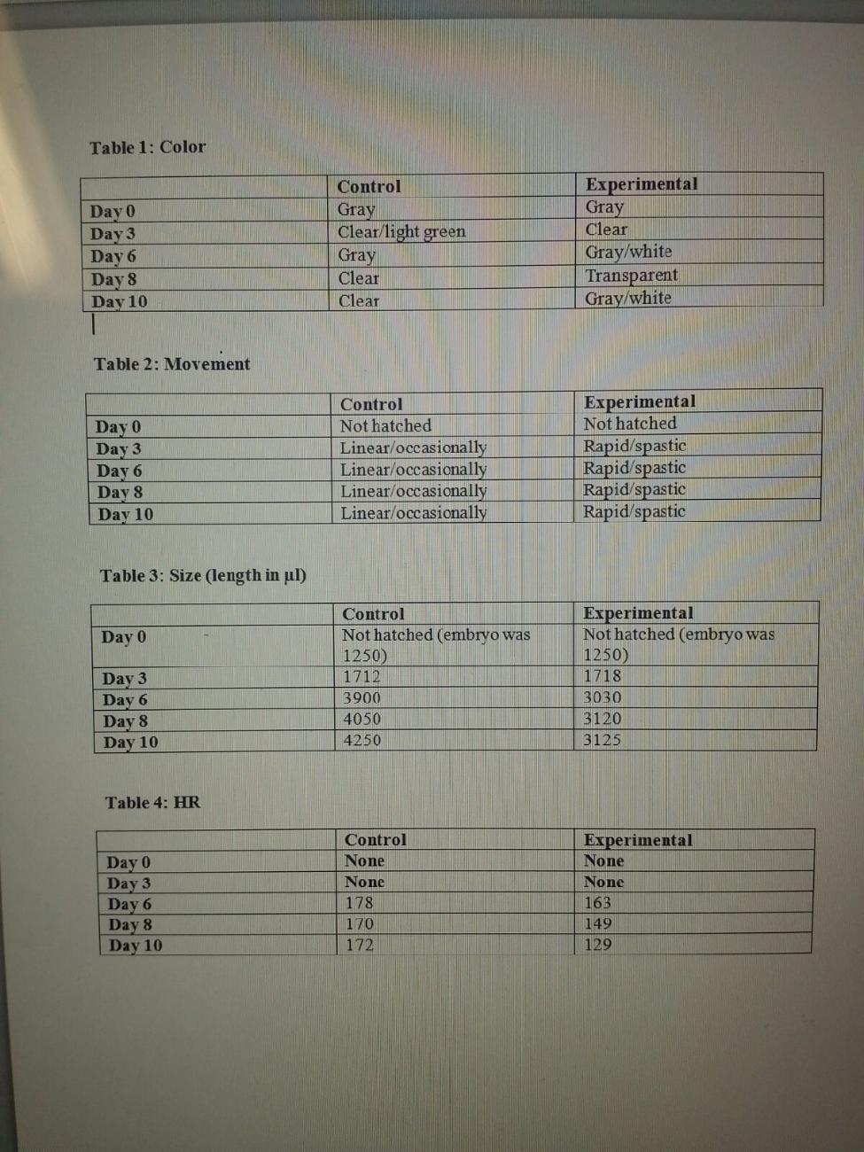 Table 1: The color of the fish in the control turned green, while the fish exposed to alcohol only turned clear and white. Table 2: The control group fish moved fast, but in a linear direction, while the fish exposed to alcohol moved quick and spastically. Table 3: The control group fish grew larger in length than the experimental group which only grew to about 1/3 the size. Table 4: The heart rate of the control group stayed normal throughout the entire experiment, while the experimental group's started and stayed at a lower rate.