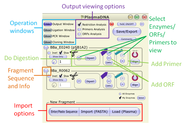 PlasmaDNA[1] is a free to use computer programme developed by the University of Helsinki to allow the easy mainpulation of DNA in silico. In the hands of an experience user, it can be used to fully plan out the assembly of a synthetic construct from base parts, genome sequences, cDNAs - basically any DNA input for which a text or FASTA file can be found. The ability to attempt a cloning strategm in silico before going into the lab can help identify bottlenecks and critical paths while allowing the user to visually see what they are producing.