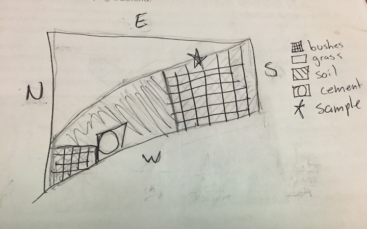The transect the group received was a piece of land that that interacted with a sitting area. Its location was in the center of the Quad. From East to West, the transect had grass that lead up an area of bushes. This area of bushes was supported by soil under it but the soil also had its own area. The soil would also meet up with the cement bench. The biotic components of this transect were the bushes, soil, and grass. The abiotic components of the transect was the cement bench. This image is a sketched aerial-view of the transect with both biotic and abiotic factors.