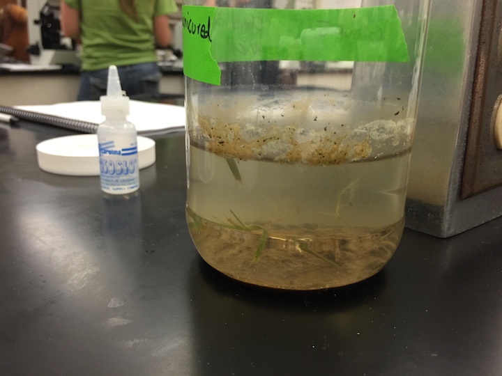 Data/Observations: When the lid was taken off the container there was a dirt like smell. The appearance was a rather brown looking color but it was not dirty enough because there was still plenty of visibility. From an aerial view of the liquid, there was mold floating on the water while the dirt and grass sank to the bottom. This image shows a side view of the Hay Infusion Culture.