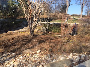 Biotic components: trees, moss, bushes, shrubs, grass, berries Abiotic components: stepping stones, arboretum signs, shade from buildings, benches, pebbles, soil, the little bit of snow