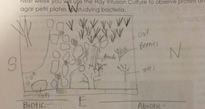 We took two samples for microscopic observation. One came from the very top layer of the jar with the layer of algae and the other came from near the moss at the bottom of the jar. The organisms may differ based on the location that we pulled samples form due to the fact that some organisms may prefer an area with more light and algae and others may prefer an area with more soil and plant matter.