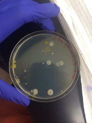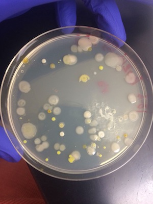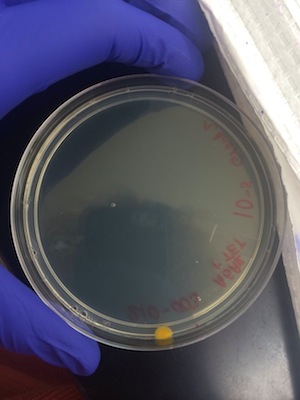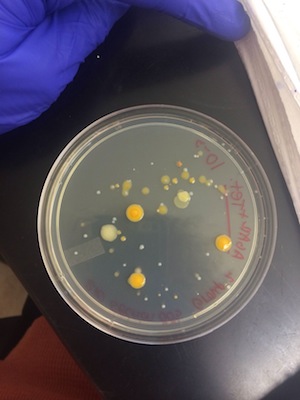 Materials and Methods: In order to understand bacteria and observe resistance bacteria from the Hay Infusions were placed on 8 serial dilutions. Four of the serial dilutions had just an agar nutrient and the other four had agar nutrient and tetracycline. Therefore if any bacteria grew on the agar plates with tetracycline, it would be understood that that bacteria was antibiotic resistant. These plates were prepared one week before this lab was completed. The bacteria that had grown was observed and recorded, taking into account the dilution, agar type, colonies counted, and the colonies per mL. Bacteria cell morphology was the observed using the bacteria from the agar plates, including the plates with tetracycline if bacteria had grown. This was done by creating four wet mounts using two bacterial samples from the agar plates without tetracycline and two samples from the agar plates with tetracycline. To crete a wet mount one sterilizes a loop over a flame, scrapes a tiny amount of growth from the surface of the agar plate and mix it with a drop of water on a slide. Then place a cover slip over the slide. The bacteria was observed under a microscope at 10x and 40x. Then oil was used to observe the slides at 100x. Four gram statins were then made using bacteria samples from the same colonies within the agar plates. In order to prepare these slides one first sterilizes a loop over a flame, scrapes up a tiny amount of growth from the agar plate and mixes it with a drop of water on a slide. The pass the slide, bacterial smear side up through a flame three times. Next, working over a staining tray, cover the bacterial smear with crystal violet for 1 minute. Rinse the stain off with a bottle of water. Cover the bacterial smear with Gram's iodine mordant for 1 minute. Rinse the stain off using a bottle of water. Next, decolorize by flooding the bacterial smear with 95% alcohol for 10-20 seconds. Rinse gently with water. Then cover the smear with safranin stain for 20-30 seconds. Rinse the stain off with water. Blot the excess water carefully using a kimwipe. Coverslips were not used. This process was completed four times to make four slides. The slides were then observed using a microscope with 10x and 40x. Lastly, PCR set up was completed for 16s sequencing. In order to do this first transfer a single colony of bacteria to 100 μL of water in a sterile tube. THen incubate at 100 degrees celcius for 10 minutes in a heating block. Next centrifuge the samples for 5 minutes at 13,400 rpm. During the centrifugation, add 20 μL of primer/water mixture to a labeled PCR tube. Mix it to dissolve the bead. Lastly transfer 5 μL of supernatant from the centrifuged samples to the 16s PCR reaction and place the tube in the PCR machine. These was done 4 times with 4 different bacterial samples from the agar plates.