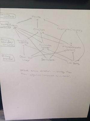 In conclusion the hypothesis that the invertebrates collected from the transect would include mites, springtails, small beetles, nematode worms and spiders, was partially correct. We did find small beetles, spiders and worms. The data from table 1 supports this conclusion. The size range of organisms that we found was 0.5 mm- 2 mm. The annelid worm was the largest at 2 mm. The spider was the smallest at 0.5 mm, although at this time the legs were shriveled up, so if the spider was alive it may have been the largest. The small beetle was the most common found in the leaf litter. From this small sample it was found twice. In the prepared slides that were observed one was a Planaria which is an acoelomate with a simple whip like movement. This shows that the body structure is a small body, flatworm. The second organism was a Nematode, which is a pseudocoelom round worm with undulations. An annelida was then observed, which is a coelomate with a bendy retraction movement which shows its fluid filled cavity. Lastly, vertebrates from our transect were looked for as seen in Table 2. Squirrels, chipmunks, rats, a Hawk, and a Robin were observed. A Food web as seen in image 3, based on all of the organisms that were found in Transect 2 was made. All of these organisms represent the ecological concept of community because this transect has a wide variety of species living together. They also represent a carrying capacity because the Transect was only a small piece of the greater environment. Only a certain number of each species were found. The trophic levels of each organism that was found is shown in the food wed (image 3). Each organism is benefitting the other which helps the environment and community that these organisms are living in to thrive.