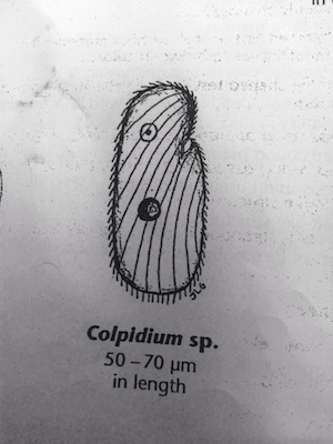 From the wet mount made from the sample taken from the bottom of the jar we observed a Colpidium. This organism was motile, is a protozoa, non-photosynthesizing and consumes nutrients. It measured to be 26 μM. We found many of these organisms, around 20, on the slide that was made from the sample taken from the top of the jar as well.