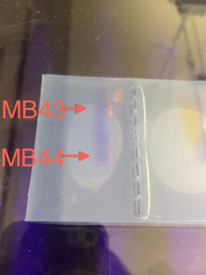 Conclusion: In conclusions, the 16s sequencing of MB43 which ID the species as Enterobacteriaceae Bacterium S2A corresponds to the data we collected on the bacteria during the gram staining procedure and colony morphology. This bacterial species is gram negative and forms a convex, round and smooth colony. The bacteria is also seen to be rod shaped which is what we saw form the gram staining as well (http://www.uniprot.org/taxonomy/1465543). The 16s sequencing of the bacterial sample of MB44, however was poor quality, which therefore produced only a 95% match to a uncultured bacterium clone. This is a broad conclusion and therefore not much information was found on this bacteria and we had nothing to compare our data from the gram sating procedure to. This could be due to the sample quality of the original bacterial sample from the agar plate. This sample also came from an agar plate with tetracycline on it, which is another possible reason for the poor quality of the 16s sequencing.