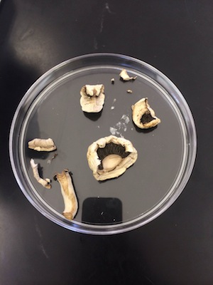 In conclusion the hypothesis that there would be a wide variety of vegetation type in the transect was correct. The data from table 1 and images 1-5 support this conclusion. Plant number one was an angiosperm, plant number two was a non-vascular plant, plant number 3 was a seedless plant with vascularization, plant number 4 was an angiosperm, and plant number five was an angiosperm. The fungi observed can be seen in images 6 and 7. Image 6 is the Mushroom which is a Basidiomycota and Image 7 is the Rhizopus Stolonifer (black bread mold) which is a zygomycota. The Black Bread Mold has sporangia which are the small, dark, globe like structures growing upward and are made up of hyphae. These sporangia give the Black Bread Mold its name and also carry spores which release when the sporangia open and allow the fungi to reproduce. These fungi are characterized by their specialized structures, such as the basidia on the mushroom and the hyphae, sporangia and rhizoids of the Black Bread Mold. The only element of this experiment would be human observation error, due to the fact that the lab was purely based off of observation.